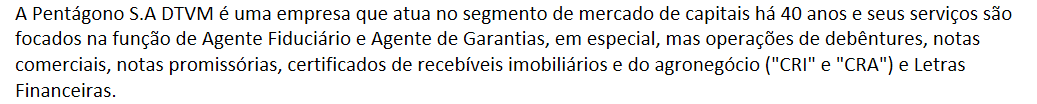 Fundada em 1985, a Pentágono é uma Distribuidora de Títulos e Valores Mobiliários altamente especializada e focada na atividade de agente fiduciário (trustee). Nossa experiência contempla desde operações mais simples de dívidas subordinadas até as estruturas mais complexas de project finance, contando com atuação destacada no setor imobiliário em CRIs e custódia de CCIs.